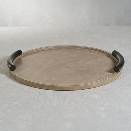 Bellecôte Round Serving Tray - Mink Leather with Metal Handles