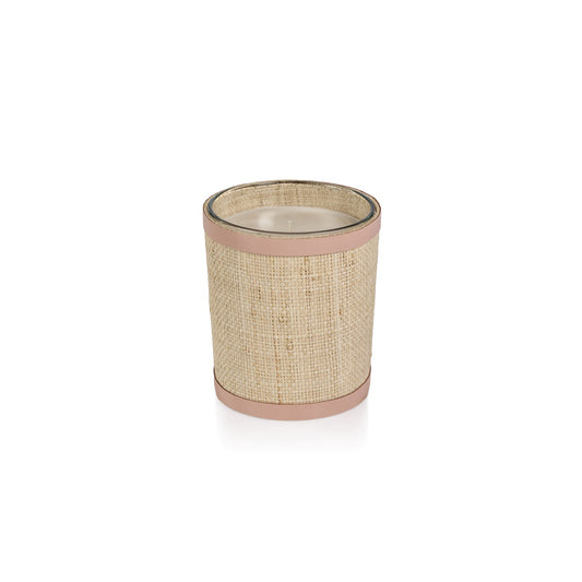Candle in Natural Raffia Basket w/ Leather Trim - Pink
