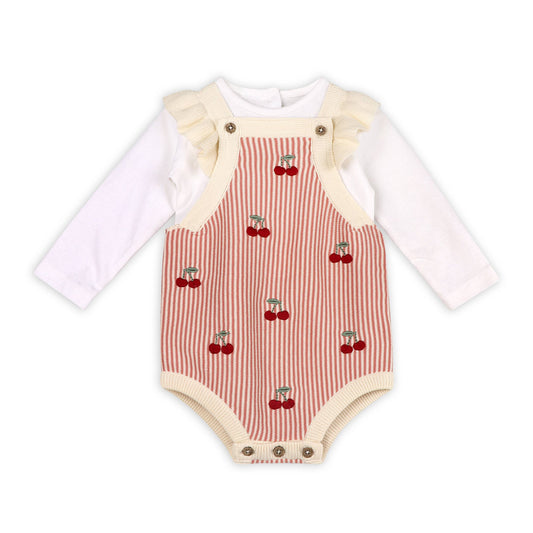 Cherry Stripe Embroidered Baby Ruffle Romper Set (Organic)