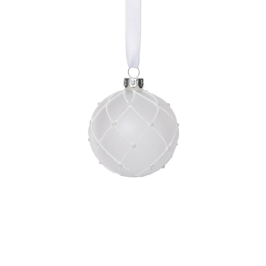 Metallic White Glass Ball Ornament with Green Leaf Design