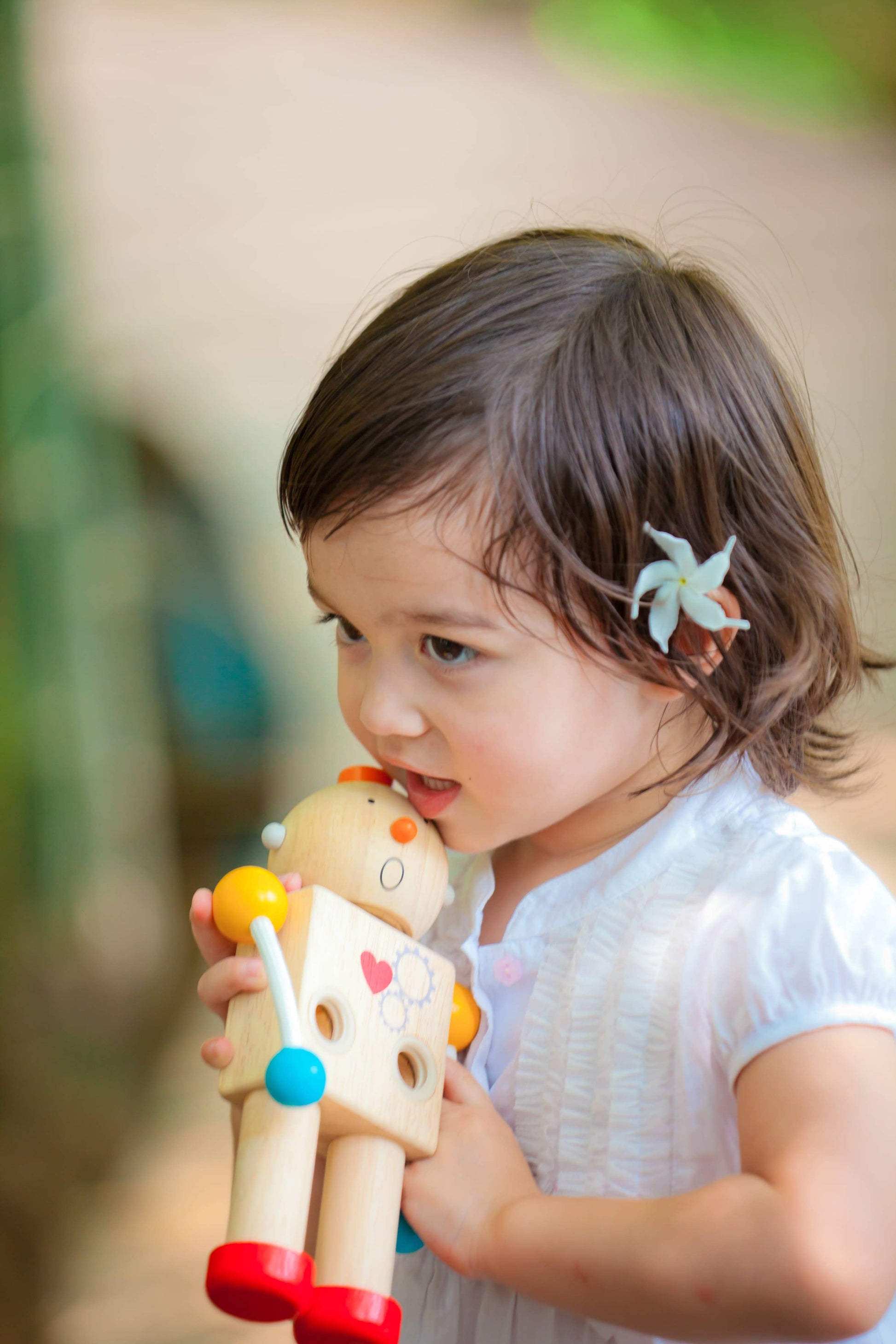 This charming robot features four interchangeable heads, which teach emotions and offer different tactile & auditory experiences. Legs are movable for standing or sitting.