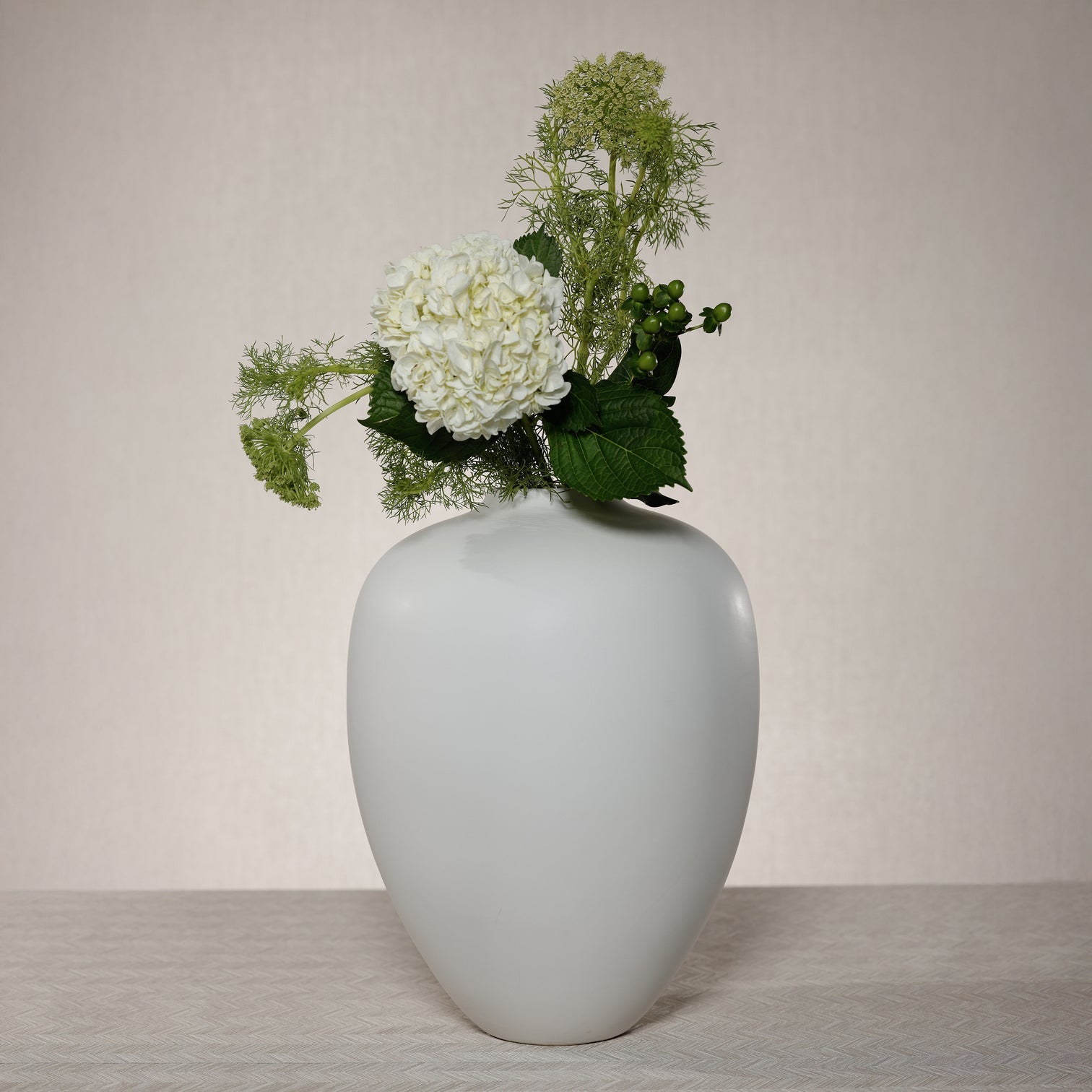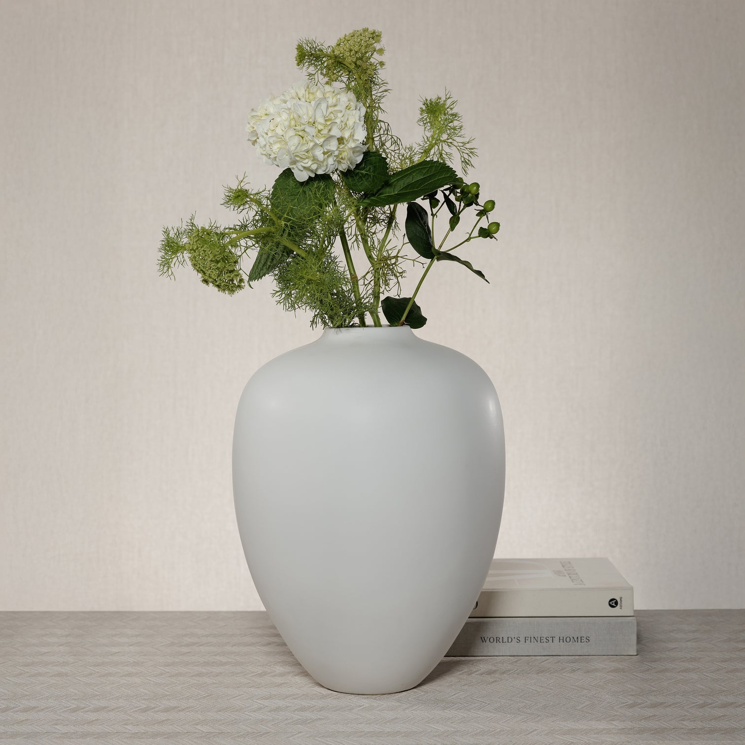Designed as both vessel and object, the Montecito Urn commands presence without excess. Its generous scale makes it ideal for voluminous hydrangeas, architectural branches, or a minimal arrangement of sculptural stems. Styled on a console, pedestal, or dining table, it anchors a space with calm sophistication.