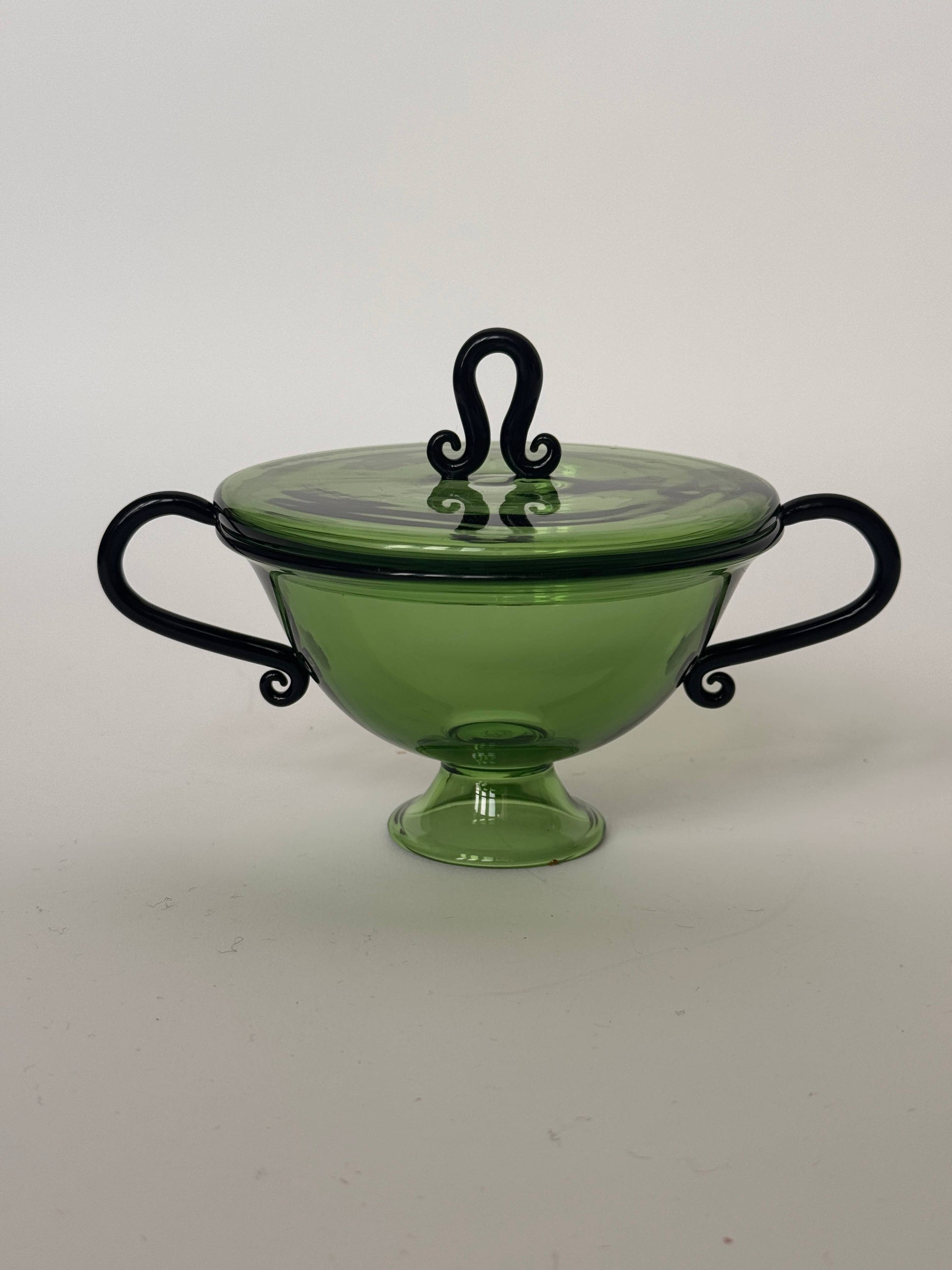 A jar for jam, chutney or sweets, this petit vessel features two delicate yet durable handles and a ribbon of glass at the center of its lid.
