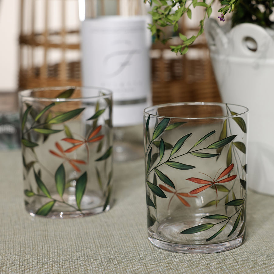 The Whispering Leaves and Dragonfly Tumbler features delicate olive branches and hand-painted dragonflies drifting across luminous clear glass. Botanical yet refined, it brings a subtle, collected charm to the table.