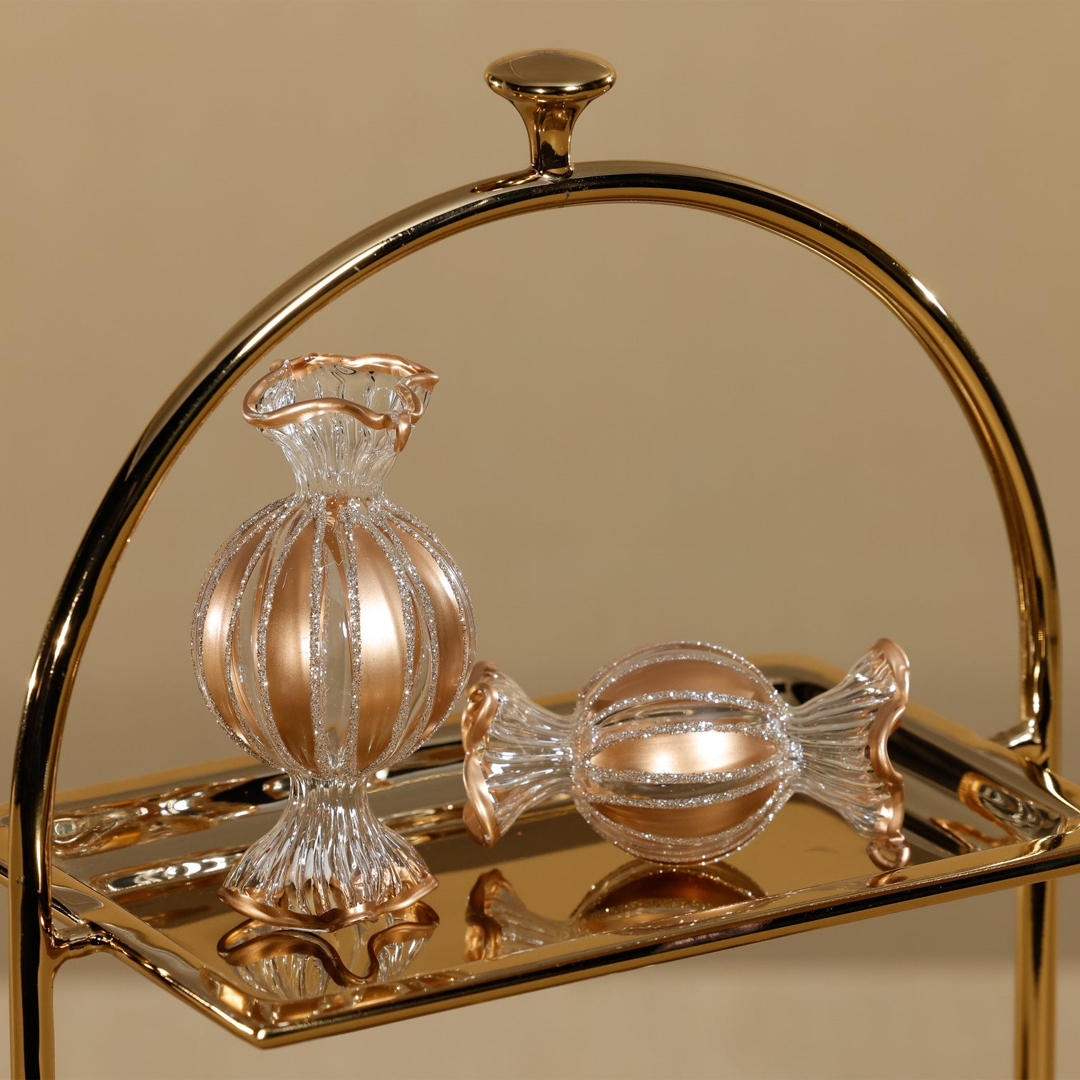 Elevate your holiday décor with this elegant set of 2 Wrapped Candy Glass Ornaments in shimmering gold and silver. These beautifully crafted ornaments add a touch of sophistication and festive sparkle to your tree or wreath. Their rich metallic hues catch the light, creating a warm, inviting glow that enhances your seasonal atmosphere. Perfect for gifting or adding a luxurious accent to your home, these ornaments transform holiday traditions with timeless charm.